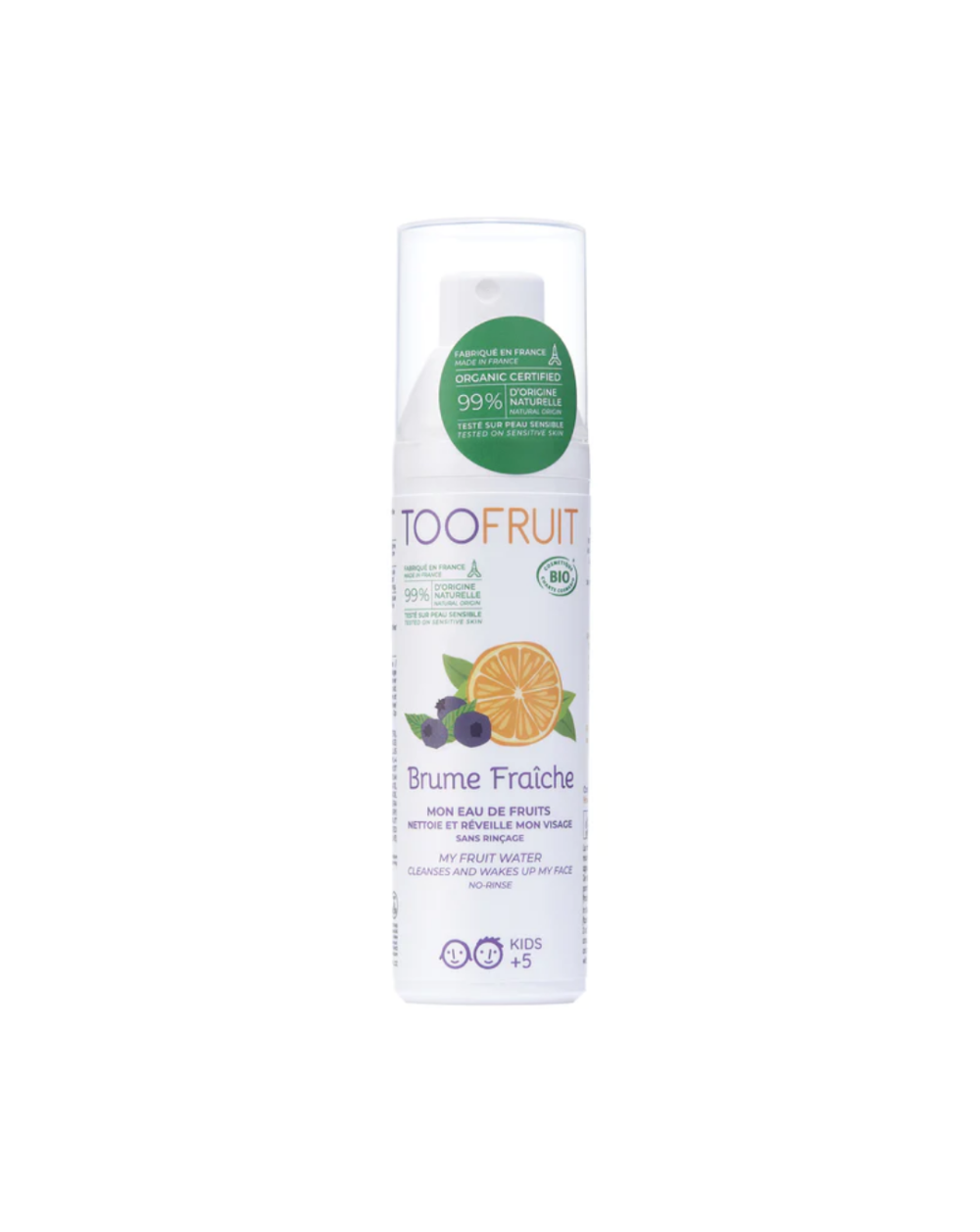Cette brume fruitée certifiée bio est idéale pour débarbouiller le visage de vos enfants. Très pratique et sans rinçage, elle nettoie et réveille délicatement la peau du visage sans la dessécher. Le plus important, elle ne pique pas les yeux ! La brume fraîche est parfaite pour un passage rapide et efficace dans la salle de bain. Elle contient de l’eau d’orange vivifiante ainsi que de la myrtille anti-oxydante.